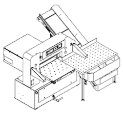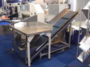 Abtransport von Schneidabfällen leicht gemacht mit dem neuen Platz sparenden Späneförderband SF-PT. Zur Platzierung des Förderbandes wurde ein verbreiteter Lufttisch 125x75cm installiert, an dessen Vorderkante ein leicht erhöhter Trichter montiert ist. Der Abfall wird in den Trichter eingeworfen und fällt in den darunter liegenden Auffangkorb des Förderbandes. Das Förderband wird in zwei Förderhöhen geliefert und kann links oder rechts der Schneidemaschine aufgestellt werden.
