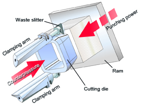 The die is especially manufactured for counter-pressure cutting, with a matrix of plastic or aluminium inside the die. The unit is connected to a compressed air supply. The material is placed in front of the matrix and is held vertical for stabilizing when the hydraulic pressure of the ram pushes the material through the die. When the ram reaches the end of its stroke, the material is pushed back into the feeding tray by the pneumatic counter-pressure cylinder. The die-cut material is then removed from the feeding tray. This reduces the throughput of the machine by half.