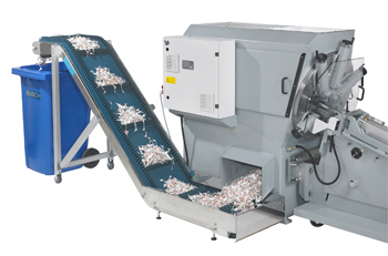 Das Förderband läßt sich entsprechend den räumlichen Verhältnissen links- oder rechtsseitig fördernd oder auch gerade wegführend von der Maschine aufstellen.