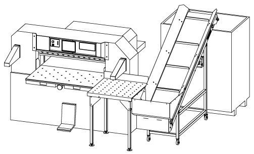Abtransport von Schneidabfällen leicht gemacht mit dem neuen Platz sparenden Späneförderband SF-PT. Zur Platzierung des Förderbandes wurde ein verbreiteter Lufttisch 125x75cm installiert, an dessen Vorderkante ein leicht erhöhter Trichter montiert ist. Der Abfall wird in den Trichter eingeworfen und fällt in den darunter liegenden Auffangkorb des Förderbandes. Das Förderband wird in zwei Förderhöhen geliefert und kann links oder rechts der Schneidemaschine aufgestellt werden.